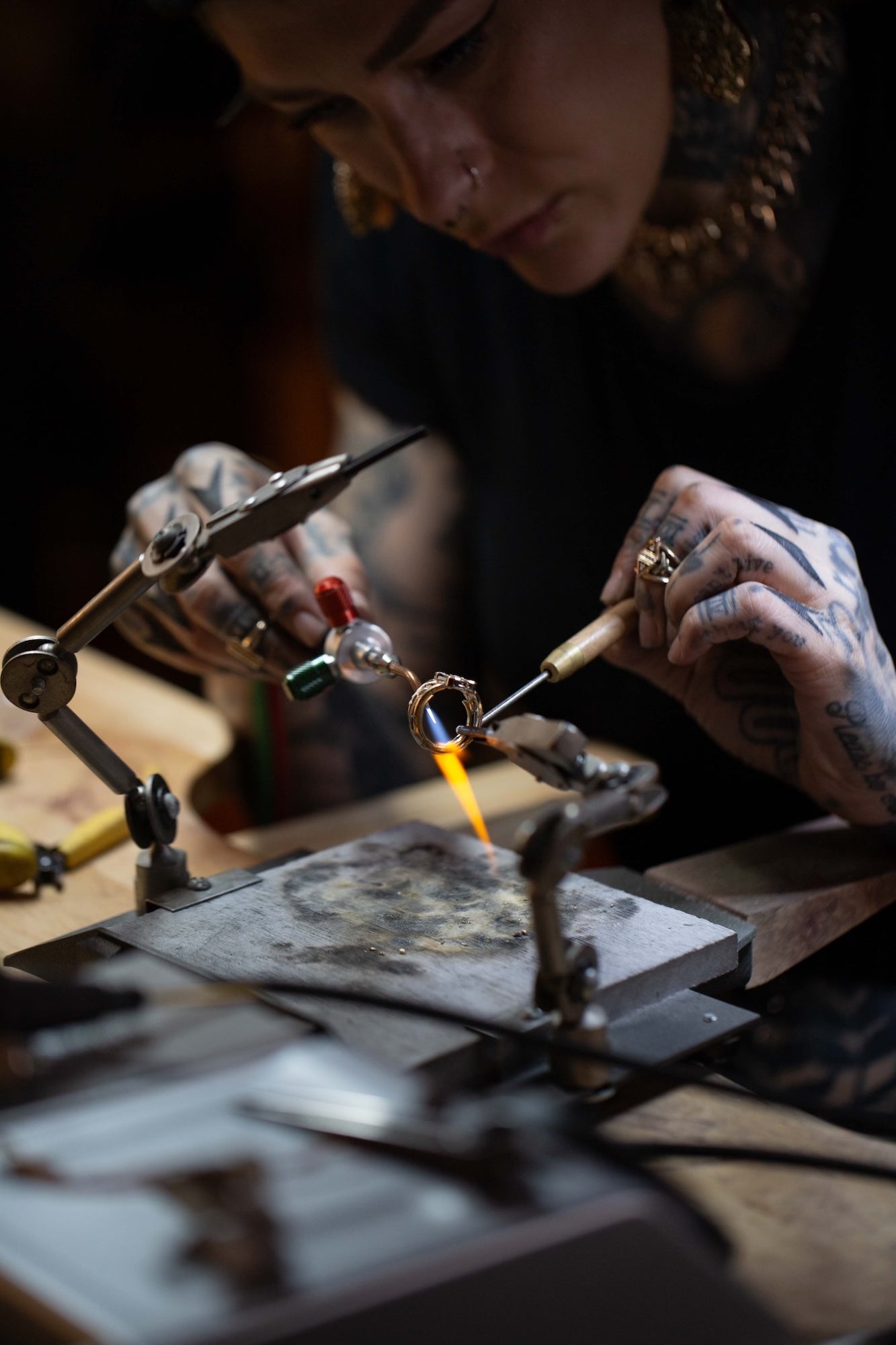Dedicating her life to and holding sacred the art of body piercing, Stephanie emerged into the jewelry world with the aim to achieve excellence while upholding the integrity of her industry. Her desire was fueled beautifully by integrating her creative passion of fine jewelry and her life in the tattoo and piercing industry.